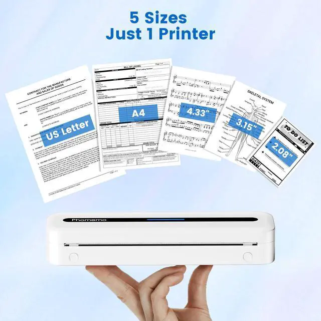 Support 5 Paper Sizes: Phomemo M832 thermal printer support print 8.5" x 11" US Letter, A4, 4.33'', 3.15'', 2.08'' thermal paper. Built-in paper bin, the wireless porta
