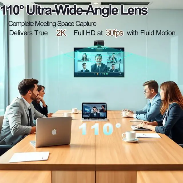 2K Ultra-High Quality & 110° Wide Angle Equipped with a 4-megapixel CMOS sensor, it smoothly presents clear images of 2560 x 1440 at a frame rate of 30 FPS. It provides vivid and clear image quality during video calls and conferences. The 110° wide-angle lens can tilt up/down by 15° and rotate 360° horizontally for flexible positioning.