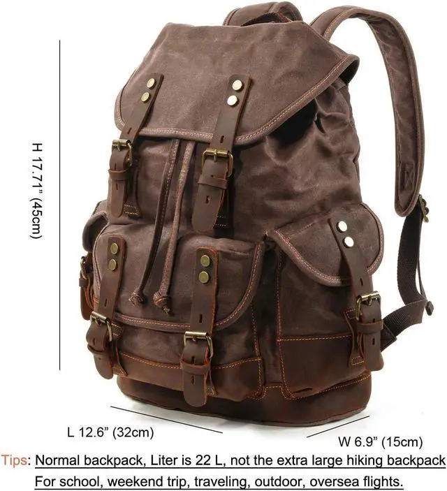 CARRY EVERYTHING - This waxed canvas backpack is Normal Size, Liter is 22L, not the hiking pack, extra large hiking backpack, Size is 12.6 (32cm) (L) x 5.9(15cm) (W) x 17.7(45cm) (H), allows you to carry large laptops (16), tablets & all necessary apparel. Main compartment features a padded sleeve with open wall pockets and stays secure under a flap with drawstring closure