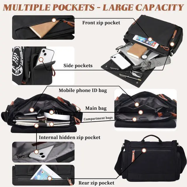 Large Capacity: Sized 15 x 10.6 x 5.1 inches(38cm*27cm*13cm), Bring your 13-inch laptop on the road with this all purpose messenger bag. Spacious main compartment perfect for your wallet, checkbook, and electronic devices, or your day-tripping necessities, side pocket for water bottle. The back zipper pocket design has an anti-theft function that protect your belongs safely