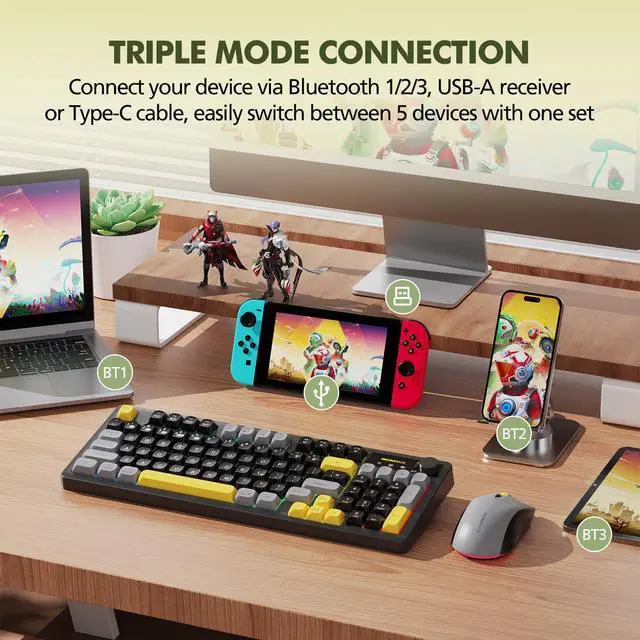 Triple Mode Wireless Keyboard and Mouse ComboConnect up to 5 devices via 2.4GHz, Bluetooth 1/2/3 or type-c cable. Easily connect multiple devices with just one keyboard and mouse set.