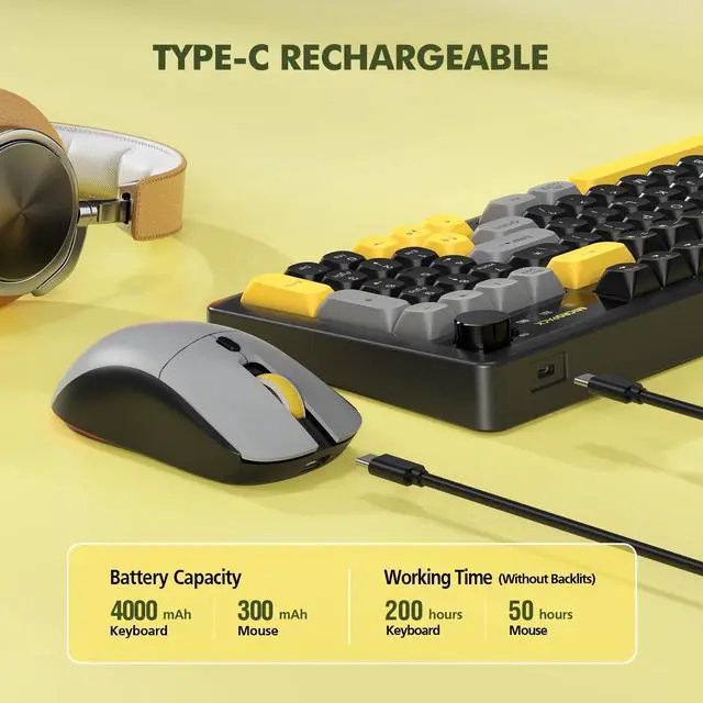 Rechargeable Keyboard and MouseBuilt-in rechargeable battery helps you save on battery costs while being eco-friendly. The keyboard lasts up to 200 hours and the mouse up to 50 hours on a full charge (backlight off). When the keyboard or mouse battery is low, a red light will flash slowly to remind you to recharge.