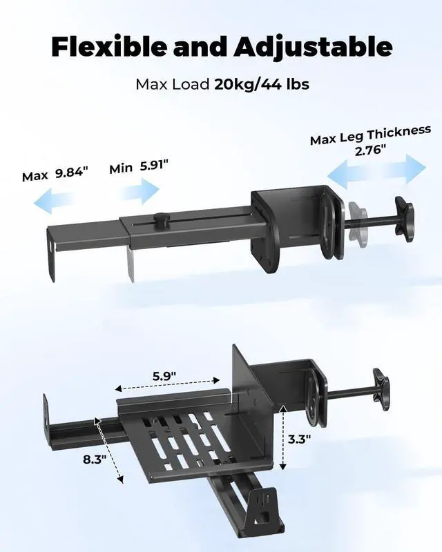 Wide Adjustable CPU Hanger: Fits most PC cases (5.9" - 9.8" wide), perfect for standing desks, works best with inverted legs, not compatible with round legs