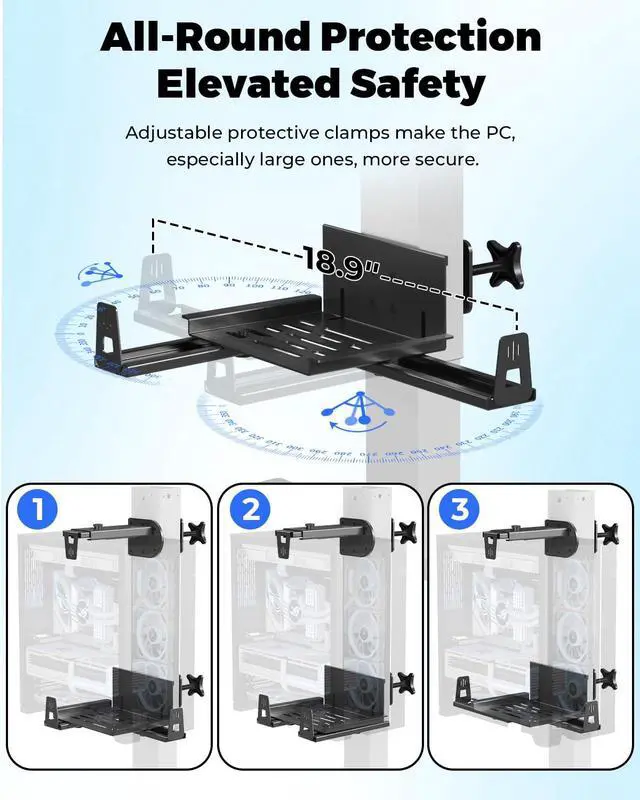 Extra Protective Arms: Added two adjustable extending securing arms on the bottom tray for extra protection of your PC. Made of thickened steel, strong enough to hold up to 44 lbs