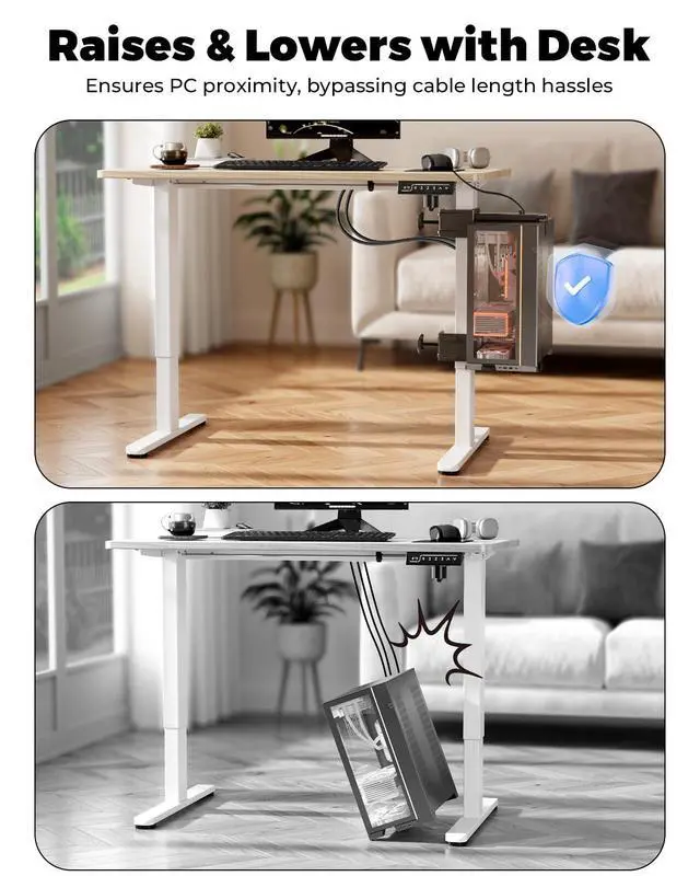 PC Mount Under Desk: No drilling required. Simply clamp the PC to the standing desk leg to prevent cable strain when the desk is raised, while avoiding collisions, dust, moisture, and bumps