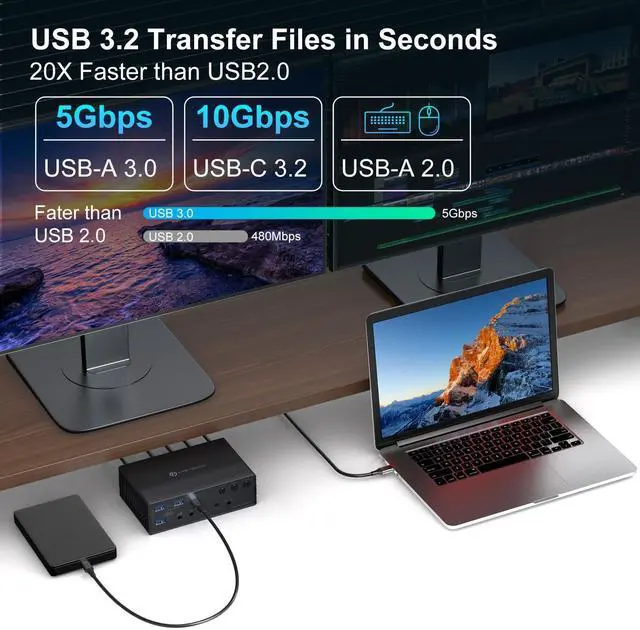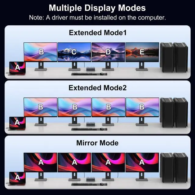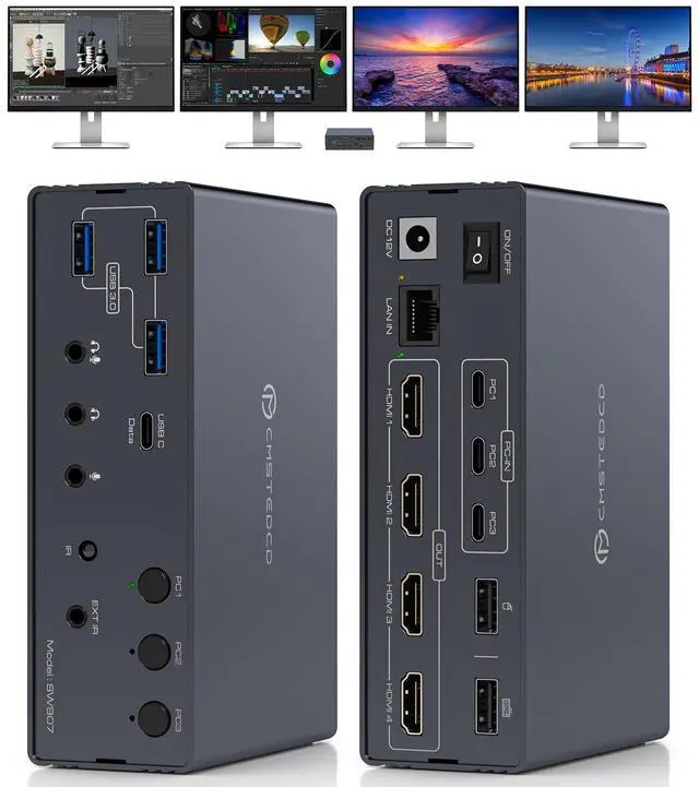 3 PC 4 Monitor KVM SwitchThis KVM switch lets three laptops & desktop (with USB-C or USB-A 3.0 +) share a full setup: four HDMI displays, multiple peripherals via its 2x USB-A 2.0, 3x USB-A 3.0, and 1x USB-C ports, Gigabit Ethernet, and audio. It features remote-control switching to create a complete all-in-one office or entertainment station ^^ Important Notice1. This KVM switch docking station requires a USB 3.0 or higher port as the input source. 2. This thunderbolt 4 kvm switch does not support charging laptops. 3. DisplayLink drivers must be installed to enable full functionality (set driver to auto-start at system boot, contact technical support if issues arise during driver installation). 4. When the device is running, it will occupy computer system resources. Ilt is recommended to use aCPU of I7 or above and at least 16GB of memory ^^ Wide Compatibility This docking station with kvm switch seamlessly integrates with macOS, Windows, Chrome OS, and Linux and Android systems; compatible with four laptops or desktops. Simply ensure your computer has a USB 3.0 (or higher) port and download the DisplayLink driver to unlock the full functionality of this KVM dock ^^ Support Ultra HD 4K@60hz VisualsThis kvm switches supports simultaneous output to four 4K60Hz displays and is backward compatible with lower resolutions.