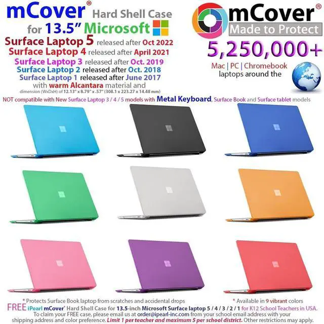 NOTE: Before placing order, PLEASE make sure to verify your laptop model number as this case is MODEL specific and NOT interchangeable. ^^ NOT compatible with the 13.5 -inch Surface Laptop 3 / 4 / 5 with METAL keyboard, all Surface Book models, all Surface tablet computer and any other non-Microsoft computer models ^^ Made of high-quality translucent polycarbonate material, which is shatter-proof and will protect your 13.5 -inch Microsoft Surface Laptop ( 5 / 4 / 3 / 2 / 1 ) Computer with Alcantara Keyboard all around. ^^ Designed to perfectly fit the 13.5 -inch Microsoft Surface Laptop ( 5 / 4 / 3 / 2 / 1 ) Computer with Alcantara Keyboard and protect ALL corners. ^^ 2-piece light-weight ( 10.2 oz or 289 g) shell easily snaps on and off.