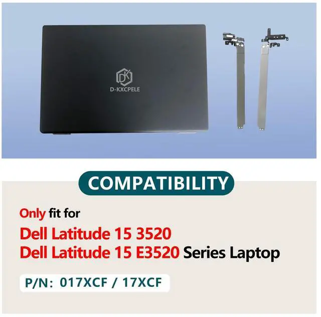 CompatibilityOnly fit for Dell Latitude 15 3520 E3520 Series Laptop ^^ P/N017XCF 17XCF WXN5F CDM80 0CDM80 ^^ Specification1 x LCD Back Cover+Hinge ^^ WarrantyAll new compatible replacement products undergo rigorous testing before shipment to ensure a worry-free shopping experience for our customers ^^ Customer SupportIf you encounter any issues or have questions about the product, D-KXCPELE's customer support team is available to assist you. ^^ NotePlease ensure compatibility with your laptop before making a purchase. Install the product while the laptop is powered off, or seek assistance from a professional or repair shop for further guidance.