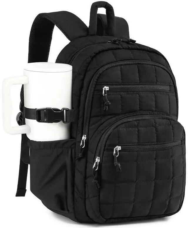 CLOKARS Quilted Laptop Backpack for Women, College Bookbag with Tumbler Holder Pocket for Nurse Teacher Work Travel, Puffer School Backpack for Teen Girls Big Student, Black