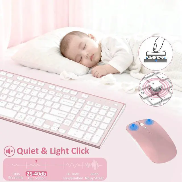 The keyboard and mouse can work from a distance of up to 33 feet or 10 meters. The keyboard features an ergonomically adjustable tilt stand. Quiet UseThe stable and quiet 120-key scissor keyboard brings a whole new level of comfort to your fingertips. The mouse left and right mute buttons and low-decibel buttons bring a new experience to your fingers. Keyboard keys and mouse keys can be used continuously for more than 5 million times. Energy Saving and PortableThe product goes into sleep mode to save energy when not in use, and you can click any button to activate the device.