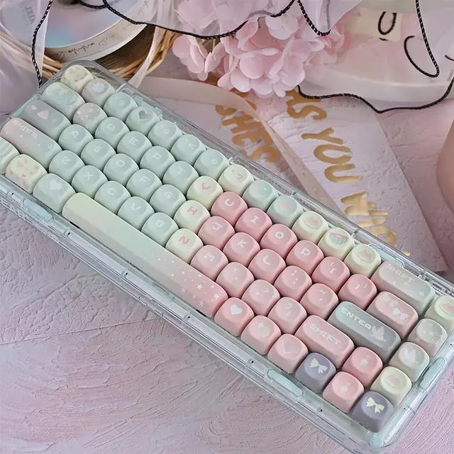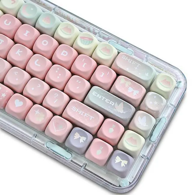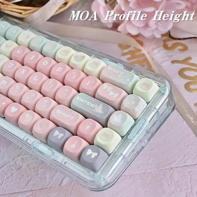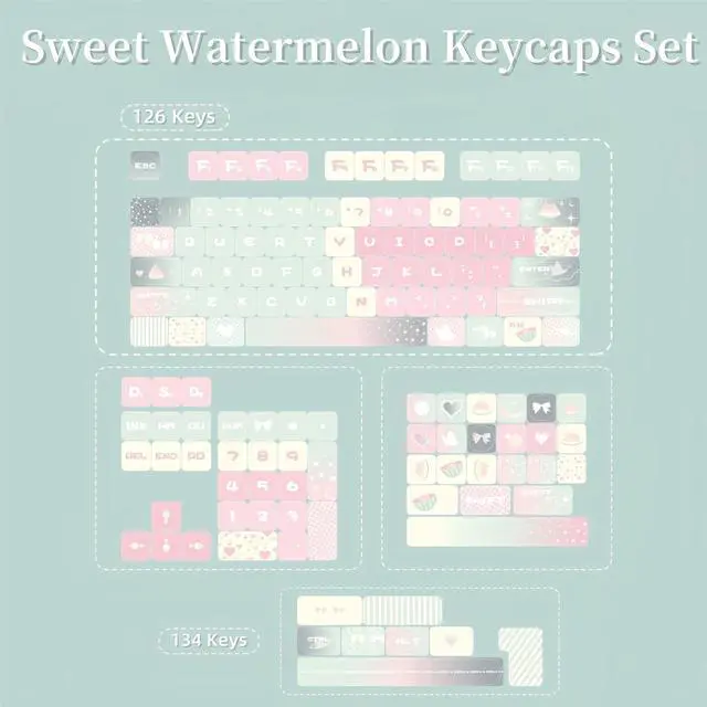 SUMMER-THEMED AESTHETIC KEYCAPSInspired by the summer sweet watermelon, the kawaii keycaps are printed with adorable watermelon and bow elements. The gradient pink and mint green keycaps match to create a fresh summer atmosphere, making your keyboard more beautiful and aesthetically pleasing ^^ MOA PROFILE ROUNDED KEYCAPSMOA keycaps have more rounded edges and stronger curvature, with a consistent height for each key, which is beautiful and lovely, bringing you delicate visual experience. The surface of MOA keycaps is concave, just like a cute little sugar cube, which can fit your fingers better and feel more comfortable ^^ DYE-SUBLIMATION PBT KEYCAPSThese keyboard keycaps are made of high purity PBT material, with a dull and textured strike, a matte texture and an anti-grease coating.