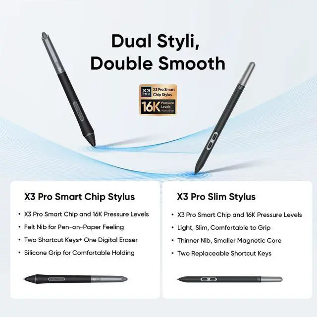 Smooth: The X3 Pro Slim Stylus is a lightweight stylus that features removable buttons to avoid accidental touches, while the X3 Pro Smart Chip Stylus has a comfortable silicone grip for long creative sessions. Both styluses are battery-free and have 16, 384 pressure levels and a 60 tilt function for a smooth drawing experience. The pen case holds both styluses, acts as a stand, and includes 28 extra nibs and 2 detachable pen clips for easy replacement ^^
