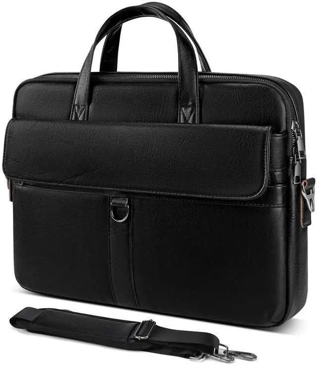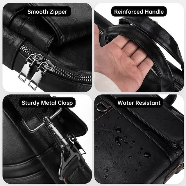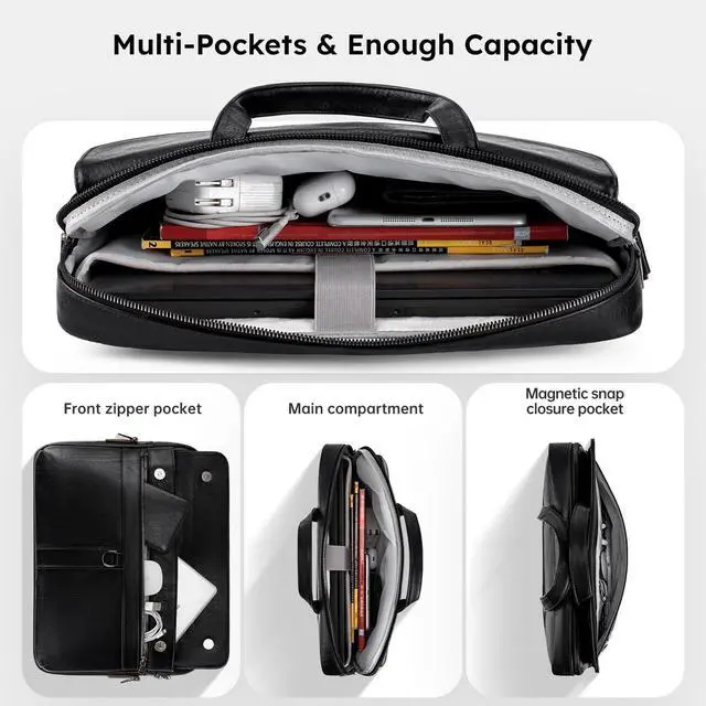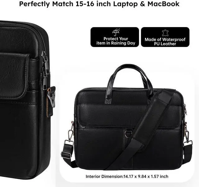 NOTE: Please compare your laptop's length, height, and depth with the internal dimensions of the product to ensure a correct purchase. ^^ Premium Leather Laptop Shoulder BagCrafted from high-quality multi-layer composite PU leather with a soft touch, featuring reinforced fabric lining, smooth zippers, and sturdy hardware. Offers excellent daily water resistance and easy stain cleaning. The top double handle provides convenient carrying options. ^^ Multi-Pockets & Enough CapacityThe leather macbook air bag features a main compartment with foam padded sleeve fits MacBook Air 15 or Pro 16, a front magnetic snap closure pocket, and zipper pocket. This design ensures secure and convenient storage for your MacBook, cell phone, earphones, passport, keys, Kindle, wallet, credit card, iPad, and sunglasses. Easily holds laptops and every accessory you could have. ^^ Adjustable & Removable Padded Shoulder StrapFeatures a durable metal buckle for easy adjustments. When not in use, the strap can be removed, allowing you to carry the bag by hand, offering a simple and stylish design. The leather laptop bag comes with a flat pass-through strap along the back for putting on your carry-on luggage.