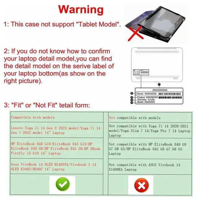 ^^ Warning: NOT compatible with Yoga 7i 14 2020-2021 model/Yoga Slim 7 14/Yoga Pro 7 14 Laptop and NOT compatible with HP EliteBook 840 G8 G7 G6 G5 laptop {{Warning: Most of returned because of choosing wrong model, please confrim your laptop model}}. ^^ This protective cover is made of the high-quality PU leather, characterized by the beautiful appearance and fine hand feeling; the inner-layer soft cashmere can better protect the laptop. ^^ Unique design with two elastic rubber bands could solve the problem of loose cover effectively in the process of using laptop (This case not support "Tablet model"). ^^ Unique liner design for laptop cooling, this case do not affect the heat dissipation of the laptop. Our store have 500+ laptop models cases, search more laptop models's case, please search "Alapmk + your laptop model".
