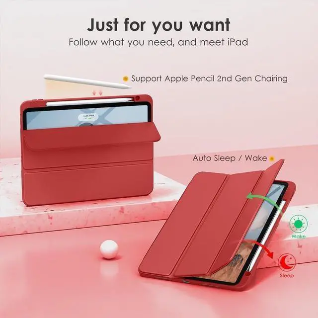 • [ Multiple Function]: This iPad case has Pencil Holder to support 2nd Gen Pencil wireless charging, Camera Protection cover, built-in magnets design that supports Auto Wake/Sleep, Tri-fold front cover that gives you 2 different view angles.
