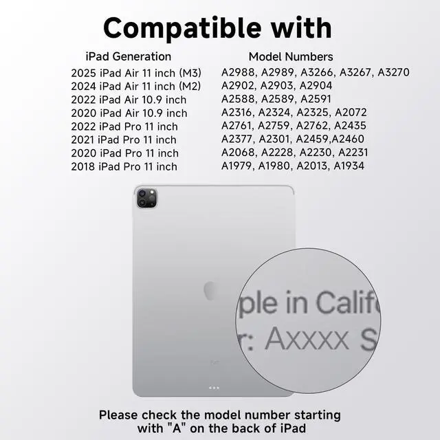 Compatibility: Perfectly designed for the iPad Air 11 inch(M3/M2 2025/2024), iPad Pro 11 inch (2022/2021/2020/2018), iPad Air 5th Generation (2022), and iPad Air 4th Generation (2020); models A2759, A2435, A2761, A2759, A2435, A2761, A2316, A2324, A2325, A2072, A2377, A2459, A2301, A2460, A2068, A2228, A2230, A2231, A1980, A2013, A1934, and A1979, Prior to purchase, verify the iPad model number (denoted by the prefix "A" on the device's rear casing) to ensure compatibility.