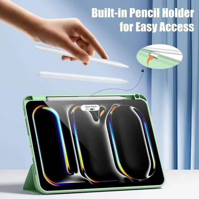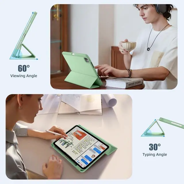 (Please note: Pencil is not included) ^^ Two Different Angles in UseThe trifold design for iPad case with pencil holder provides two convenient viewing angles for everyday use. Adjust it to 30 when typing, drawing, or chatting, and to 60 for watching videos, handling emails, or video calls. Choosing the correct angle ensures a more comfortable experience in various positions. ^^ Auto Wake & SleepThe magnetic 11 pro case supports auto wake functionality, eliminating the need to press any buttons. Its auto-sleep feature extends standby time, conserving energy and reducing the frequency of charging for iPad pro 11 inch case.