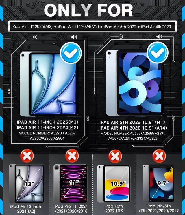 Compatibility: It's only designed for iPad Air 11-inch (M3) 2025 / (M2) 2024 and iPad air 5th/4th generation (Air 10.9 inch 2022/2020).