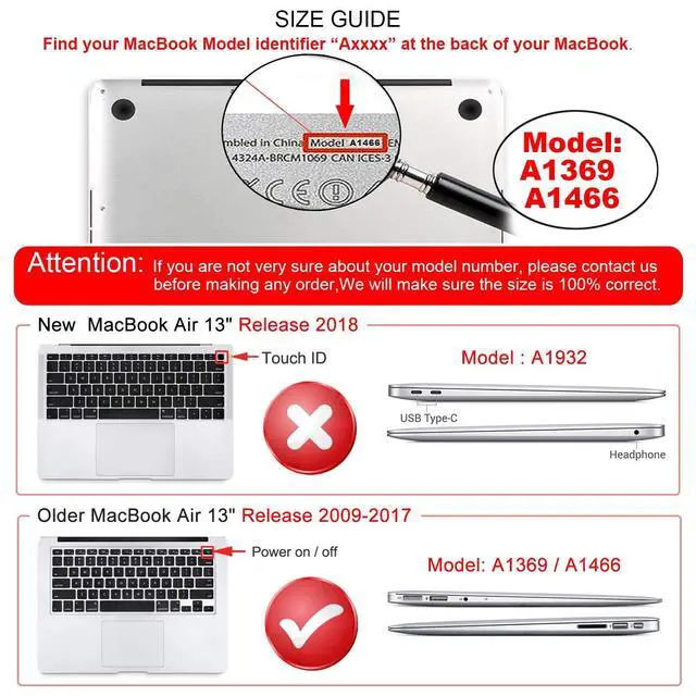 [NOTE]: ONLY Compatible with Apple Macbook Air 13 inch Model A1369 & A1466 (Release 2010-2017 Older Version). Not compatible with other MacBook model. Please kindly check model number "A1xxx"on the back of the MacBook before your purchase.