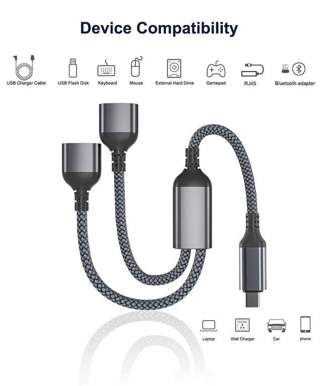 Features: Add two USB-A ports instantly to any compatible USB-C device Double-braided exterior and sleek aluminum-alloy finish Two-layer shielding minimizes signal interference