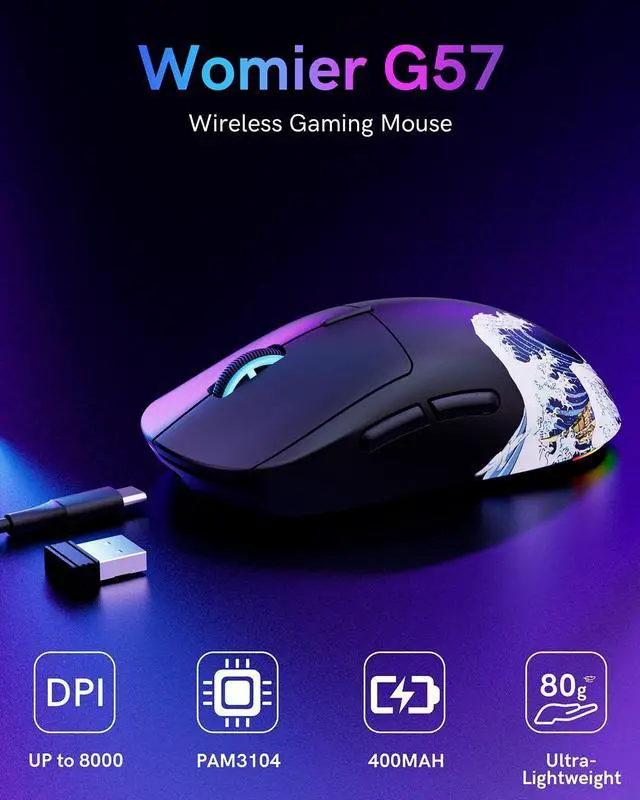 Typehaven G57 Wireless Gaming Mouse, 8000 DPI, 80g, 2.4G/Bluetooth/USB-C Rechargeable Wireless Mouse with 5 Programmable Buttons for PC/Mac, Black