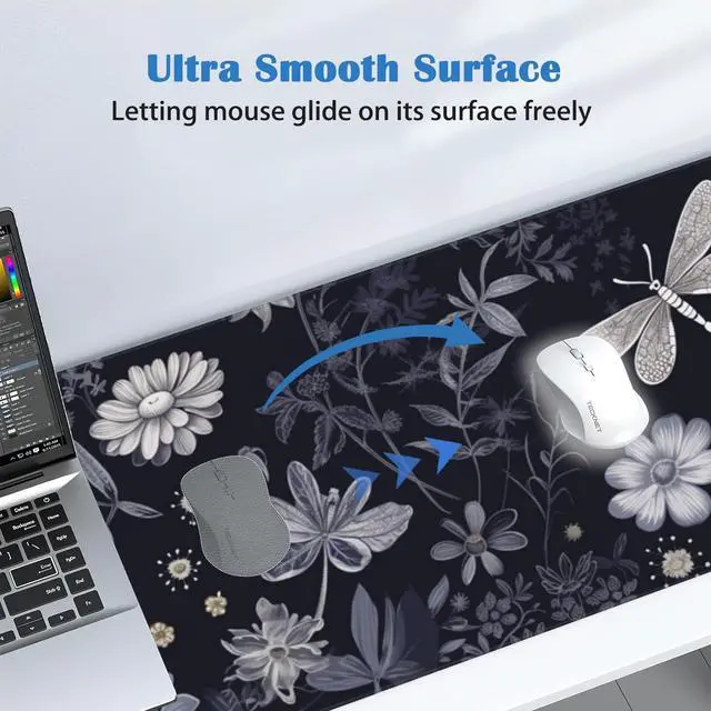 Dark Blue Mouse Pad Gaming,Dragonflies Daisies Mousepad Desk Mat,Smoothing Fabric Mousepad for Fluid Control,Ultra-Stable Non-Slip Rubber Base Mouse Pad,Stitched Edges(31.5x15.7 in)
