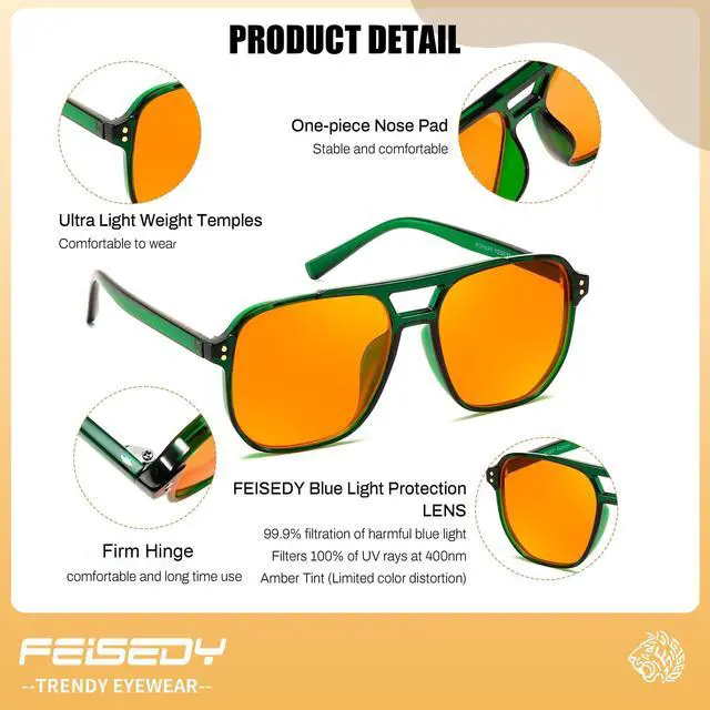 • Sleep Glasses - Numerous studies have shown that prolonged exposure to blue light can slow or stop the production of melatonin,Blue light exposure before going to bed will reduce the quality of sleep recovery. FEISEDY AMBER BLUE LIGH GLASSES helping your body produce melatonin faster and fall asleep faster and enjoy a more restful sleep.
