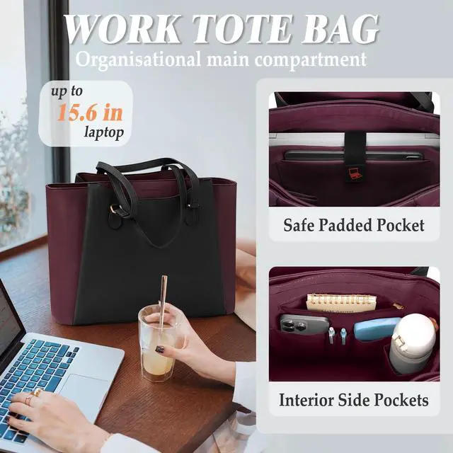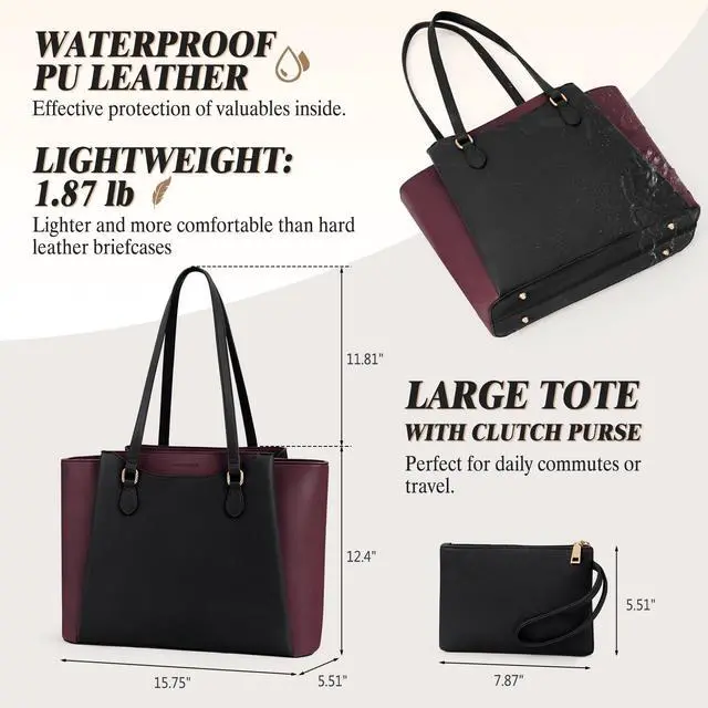 PROFESSIONAL LAPTOP BAG FOR WORK: This work tote bag has a dedicated padded pocket in the main compartment fit for laptops up to 15.6" and tablet PC, protects electronic devices from accidental drops or impacts. There are also 2 open pockets, 2 pen insert pockets, 1 zip pocket and 1 water bottle pocket to keep items organised. And 3 large capacity magnetic compartments on the outside of the tote bag for safely storing valuables and other frequently used items that need to be accessed quickly. ^^ ELEGANT WORK BAG FOR WOMEN This computer tote bag is made of PU leather, which is waterproof, scratch-resistant and durable. The inner lining of the laptop purse is made of high quality polyester which is soft and tear-resistant, and no matter how vigorously you rummage inside the bag in office setting or conference, it won't make an annoying "crunchy" sound. There are 4 metal feet and flat insert at the bottom, so the handbag can stand up by itself and remain elegant at all times. ^^ LARGE CAPACITY & COMFORTABLE TO CARRY: This large tote bag for work measures 15.75" * 12.4" * 5.51", providing spacious storage space for laptop, files, books and other daily necessities. The womens laptop purse's 11.81" handle drop length ensures easy carrying by hand or over the shoulder. This soft leather work briefcase weighs only 1.87 lb, which is lighter than the hard laptop tote for women, making it the perfect choice for daily commuting and professionals on the go. ^^