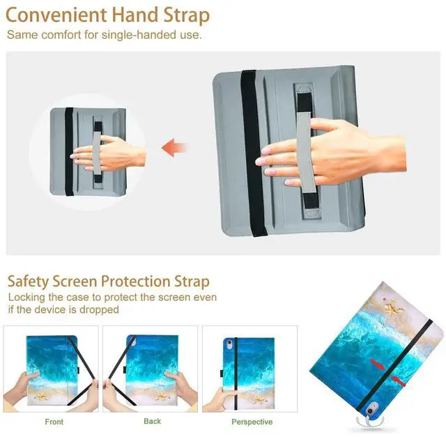 Screen Protection Band: Tie and lock the iPad Case with the Screen Protection Band when not using the iPad. To keep the case closed if the device falls, and gives much better protection to the screen. Add an extra lock to your device and privacy when you're not using; The Convenient Hand Strap beside the stripes enables you to hold it more stable when stays upright. Same comfort for single-handed use.