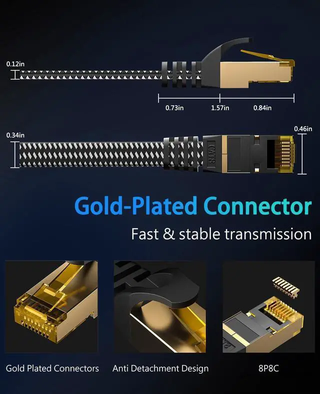 Excellent Anti-Interference: Our Cat 8 ethernet cord are made of 4 pairs foiled twisted pair (FTP) copper wires with 24K gold-plated RJ45 connectors ^^ Flat Cat 8