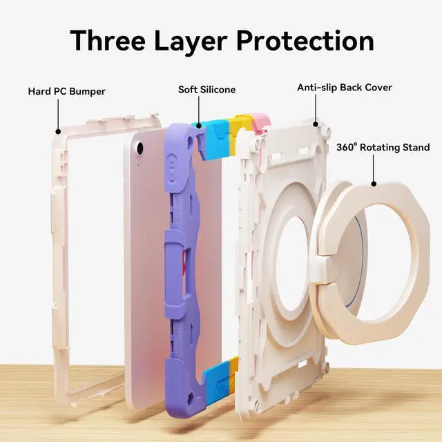 Three-layer Protective Structure: The three-layer structure of this ipad 10th generation case provides comprehensive protection for your device. The outer layer is made of silicone, offering a soft, non-slip grip that not only enhances comfort during use but also helps prevent accidental drops. Beneath the silicone layer, the hard plastic back shell adds a robust defense against impacts and scratches, also features a shock-absorbing bumper that encircles the edges of the tablet, these three layers work in harmony to shield your tablet from damage while maintaining a sleek and functional design ^^