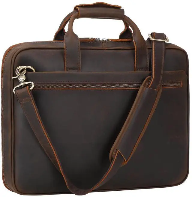 Slim Humanization DesignUltra thin about 2 (5 cm) in width, the laptop bag is more lightweight than others. 180opening design convenient for you to reach item quickly. With padded adjustable and detachable strap, the messenger bag can be carried with less effort, convertible from handbag to cross body bag or shoulder bag. You can use it as lawyers briefcase, laptop bag, or casual bag. Classic design is suitable for business persons. ^^ Full Grain LeatherThis laptop briefcase is crafted of 1.8 mm thick real cowhide leather processed with crazy horse leather technology, the nature texture of cow leather can be felt.