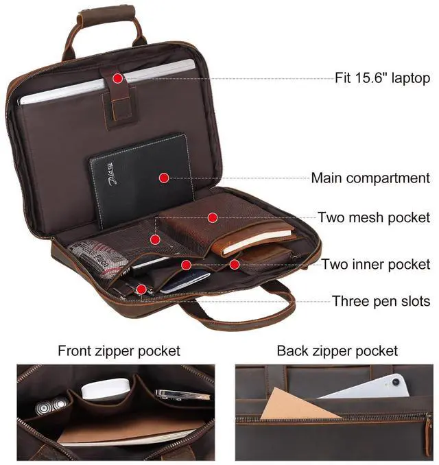 Structure: 1 front zipper pocket with 3 inner pouches; 1 middle main compartment with 15.6 inch /16" laptop fasten sleeve, 2 inner mesh pouches, 2 x inner pockets, 3 pen slots; 1 x back pocket (contains 1 key chain) with magnetic closure, and 1 back zipper pocket. The crossbody bag is roomy to store 15.6 or 16 inch laptop, A4 files, cell phone, keys and wallet, cards, pens, tablet, and other business things. ^^ Purchase with ConfidenceOne year quality commitment since you buy the mens laptop briefcase, if you have any questions or concern, please reach us, we will work to resolve the issues for you. This mens leather work bag can be a present choice for birthday, anniversary, Valentine's day, father's day, Christmas for men.