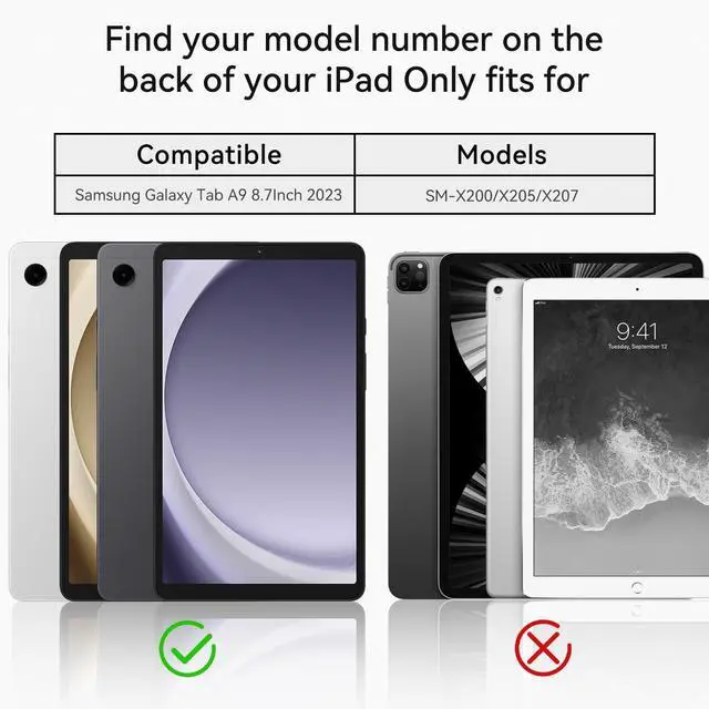 COMPATIBILITY: Only compatible with Samsung Galaxy Tab A9 8.7 inch (SM-X110/X115/X117). Do not fit any other models. Please double-check your tablet model before purchasing.