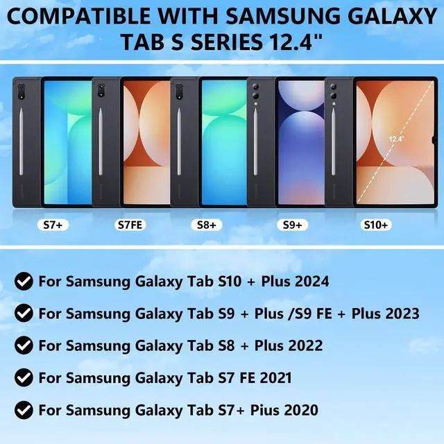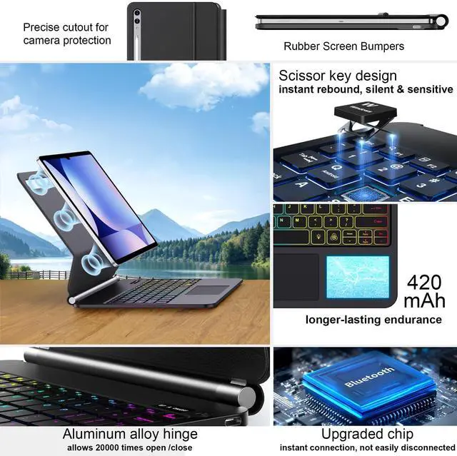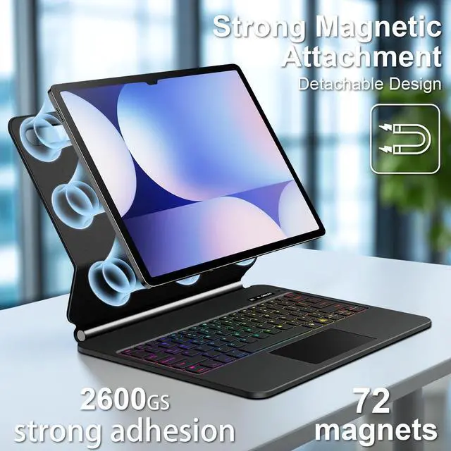 Only compatible with: Galaxy Tab + 12.4 inch 2024 (SM-X820/SM-X826B), Galaxy Tab + 12.4 inch 2023 (SM-X610/SM-X616B), Galaxy Tab + 12.4 inch 2023 (SM-X810/SM-X816B), Galaxy Tab + 12.4 inch 2022 (SM-X800/SM-X806), Galaxy Tab 12.4 inch 2021 (SM-T730/ SM-T733/SM-T736B), Galaxy Tab + 12.4 inch 2020 (SM-T976B/SM-T975). Please check your tablet model before purchasing. ^^ Exclusive Magnetic Stand with Adjustable Angles The magic-style floating cantilever stand and strong magnetic attraction hold iPad firmly and stably in place like a laptop. The floating cantilever design offers customizable viewing angles ideal for typing, reading, and multimedia consumption, making it perfect for travel, work, and daily use. ^^ High-Precision Multi-Touch Trackpad Enhances productivity with an ultra-responsive smart trackpad supporting multi-finger gesturestap, pinch, scroll, and swipefor seamless navigation, document editing, web browsing, and presentation control. ^^ Backlit Keyboard with