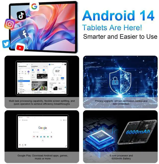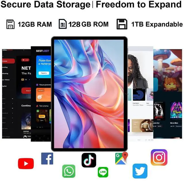 Enhanced Performance Configuration The RitmoChispa 10.1 inch android tablet runs on Android 14 OS with a 2.0 GHz octa-core processor. This combination supports efficient multitasking and responsive operation for daily tasks. With Google Play pre-installed, you have instant access to many apps like Facebook, Twitter, and Instagram on this versatile tablet. ^^ Substantial Memory & Storage Configured with 12GB of RAM and 128GB of internal storage, this android tablet delivers smooth performance for all your tasks. Its storage is further expandable up to 1TB with a microSD card (card not included), providing flexibility for your documents, photos, and media libraries on this powerful tablet.