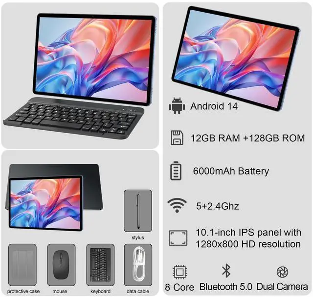 ^^ Extended Battery Capacity A 6000mAh battery supports extended usage periods for this 10 inch tablet, providing adequate power for video playback, browsing, and other activities through your day without frequent recharging. ^^ Eye-Comfort Display Design The 10 inch IPS HD (1280x800) screen is equipped with a certified low blue light mode and flicker-free technology. This advanced system actively reduces eye fatigue and strain, making this tablet safer for prolonged use during work, study, or entertainment. ^^ Versatile 2-in-1 Tablet System This bundle includes a keyboard, mouse, protective case, and stylus, the protective case also serves as a convenient viewing stand.