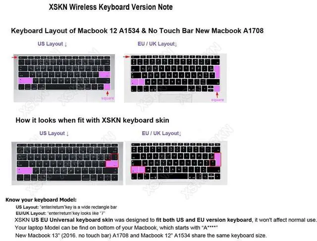 Macbook starts with"A****")Caution: XSKN US&EU Layout keyboard skin fits both US version and EU version keyboard, product looks exactly same as photo display, main difference is the "enter/return" key, it covered 2 nearby keys, do not affect normal use, printing on it will show you where to press. Suitable device must match all 3 characters (otherwise not compatible): 1. total 6 lines of keys2. key size of first line smaller than second line3. right bottom key is in square (not a slim wide bar)