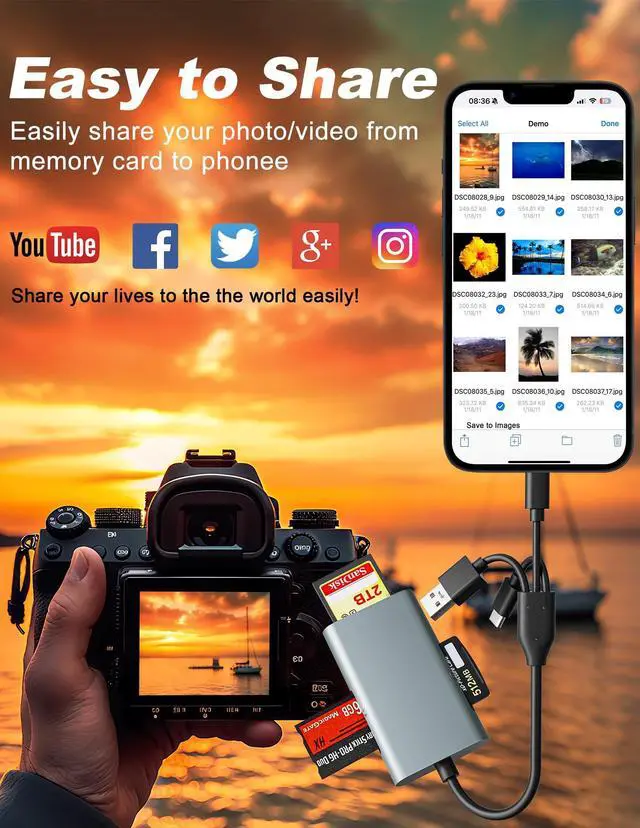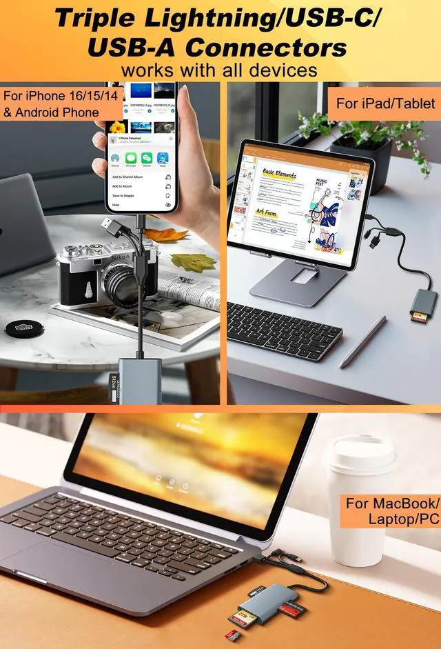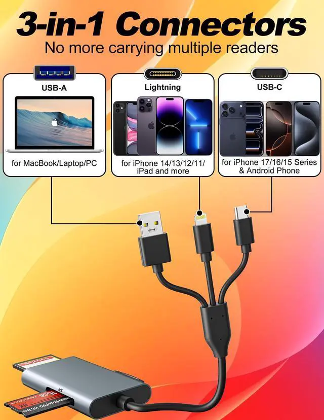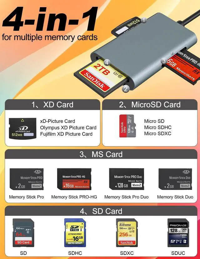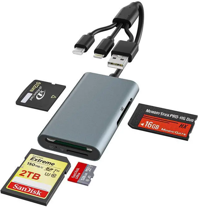 Premium Aluminum Body & Triple Interface This sony memory stick pro duo adapter crafted with a high-grade aluminum alloy casing, offers superior durability and heat dissipation. It seamlessly connects to iPhone, iPad, Android phones, PCs, MacBooks and Surface via Lightning, USB-C, and USB-A, eliminating the need for multiple adapter and it is the best Memory Stick Pro Duo reader and camera photo viewer for. ^^ 4-in-1 Camera Card Reader for Flawless Workflow This robust metal memory stick pro duo adapter is equipped with SD/MicroSD/MS/XD card slots and handles Memory Stick Pro Duo, Memory Stick Pro-HG, Memory Stick Duo, olympus xD-Picture card, SD/SDHC/SDXC and microSD memory card.