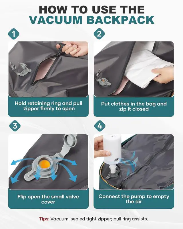 Hassle-Free Travel: Experience comfort with thick padded ventilation and adjustable, breathable shoulder straps with a sternum strap. Securely slides over luggage handles. A hidden anti-theft zipper pocket on the back safeguards valuables, making this easy vac pack backpack a secure choice ^^ Versatile Vacuum Sealing for