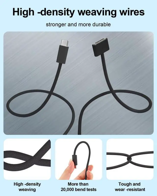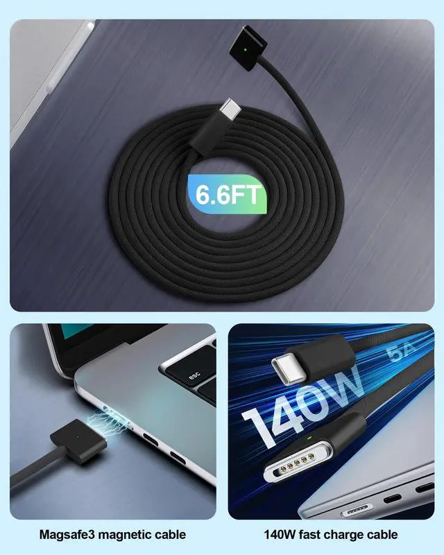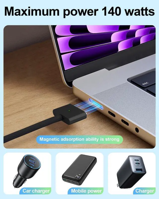 This 140W Magnetic 3-to-USB-C cable is designed for multiple MacBook models to ensure a perfect fit and optimal performance. The MacBook charger cable has a strong magnetic attraction to ensure a secure and stable connection while charging. It can be used with PD chargers, wall chargers, car chargers, and power banks. This cable ensures you charge quickly and efficiently, and comes with an LED charging indicator to keep you informed of the charging status. Compatible with MacBook Pro (14-inch and 16-inch, M2, 2023), MacBook Air (M2, 2022), MacBook Pro (14-inch and 16-inch, 2021), and models A2779, A2780, A2681, A2442, A2485