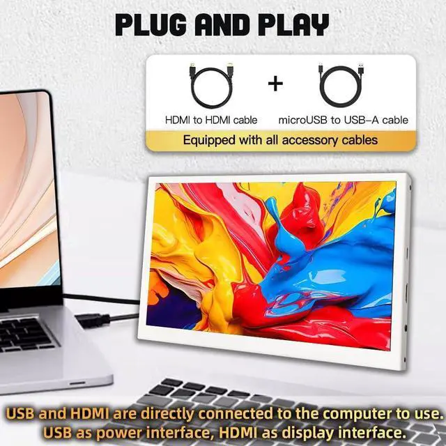 OutputPlease note: 1. Please make sure the HDMI and USB-C cables are connected directly to your computer. 2. We recommend using the original cables. What's included? 1x 10.1 inch Portable Monitor1x USB-A to USB-C Cable1x HDMI to HDMI Cable