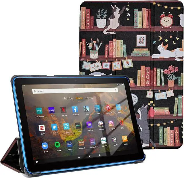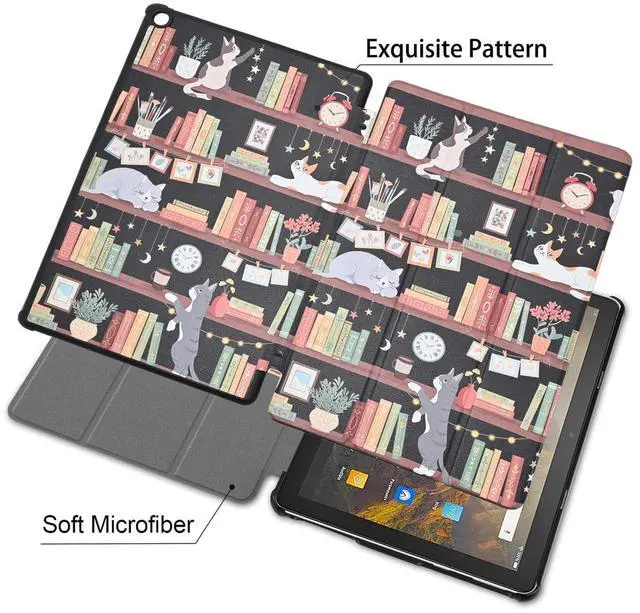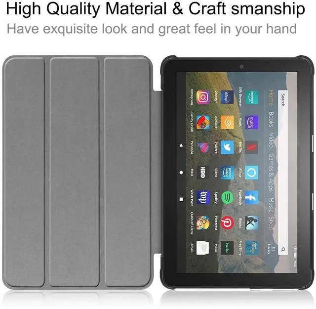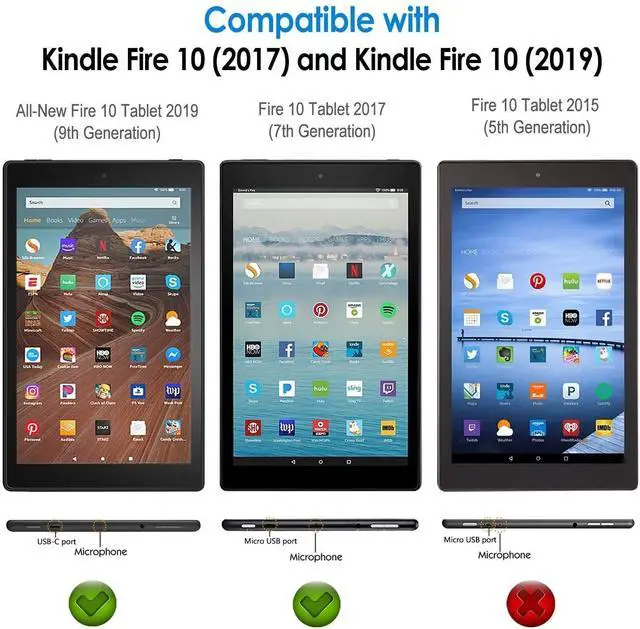 PLEASE NOTE: This case is designed for All-New Fire HD 10 Tablet (7th Generation and 9th Generation, 2017 and 2019 Release). Protect your new Kindle with this Case at all times! The Case sports a simple and classy design. The back shell is made from durable polycarbonate material so you do not need to worry about any damages. It offers an easy clip-on application. Because the cover is uniquely designed to flip back and transform the case into a comfortable viewing stand that offers two different viewing angles, this capability allows the viewer to use the new Kindle hands-free whatever your position may be without strain whether it is being used for viewing or for a keypad. All features of Kindle are accessible even with the case on. It even includes a camera hole so you can take pictures and videos without removing it. Watch movies and listen to music clearly with speaker holes!