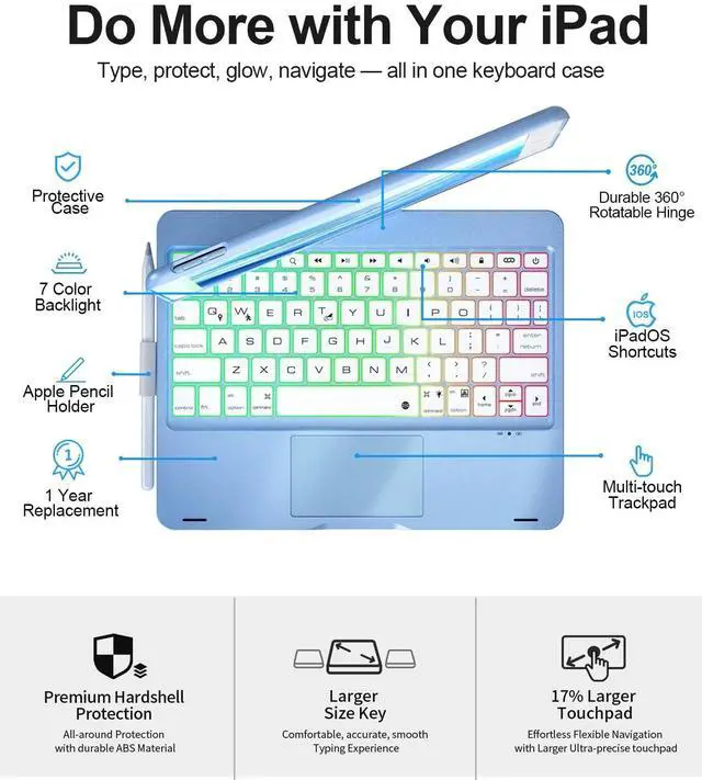 Rainbow Backlit: Illuminate your workflow with vibrant rainbow backlight, iPad 8th generation case with keyboard features 3 adjustable brightness levels. You can customize brightness and backlight color to suit your preferences and habits. Enjoy a sleek and stylish setup with Baisla iPad 9th generation keyboard case with pencil holder ^^ Full Protection & Smart