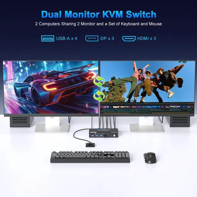 Experience seamless multi-PC control with the Tailajera Dual Monitor KVM Switch. This advanced switch supports stunning 8K resolution at 60Hz and 4K at 144Hz refresh rates, delivering crystal-clear visuals across two displays. Featuring both DisplayPort and HDMI compatibility, it offers flexible connectivity options for modern computing setups. The integrated USB 3.0 hub provides high-speed data transfer and peripheral sharing between two PCs. Smart control functionality allows effortless switching between computers with all your connected devices. The device includes multiple input/output ports: dual DisplayPort, dual HDMI, USB inputs, and a convenient front-panel USB hub with four USB 3.0 ports. Perfect for professionals who need to manage multiple high-performance workstations, content creators requiring precise visual quality, or anyone seeking to streamline their dual-computer setup. All necessary cables are included for immediate setup and operation.