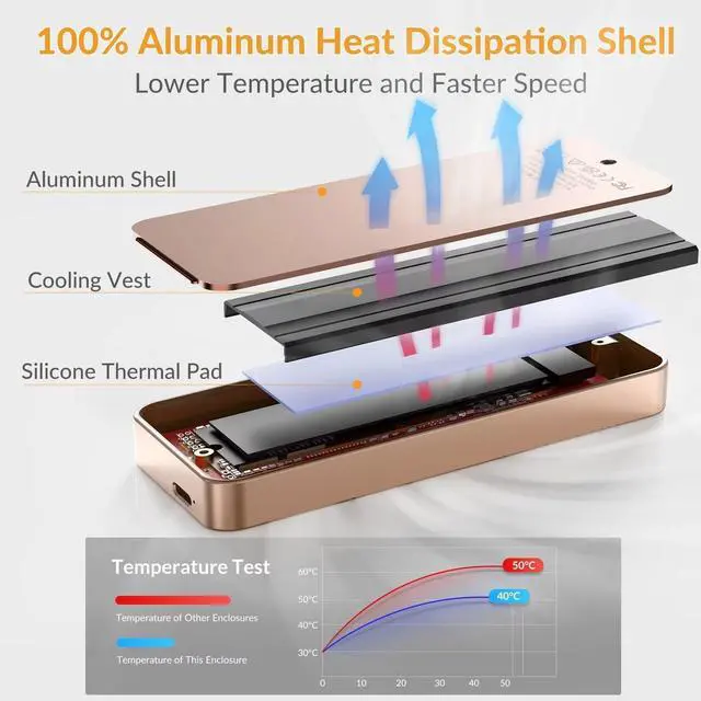in the SSD without copying to the PC. ^^ More safe and Stronger This 40Gbps NVMe Enclosure is 100% made of aluminum alloy, and uses screws to fix the shell and ssd. These designs makes it more stable than tool-free Enclosure, and make the SSD more secure in carrying. ^^ Better Heat Dissipation 100% aluminum alloy material + heat dissipation vest + heat dissipation pad, all three materials are highly thermally conductive, making this enclosure the better thermal performance of other enclosures. ^^ Wide Compatibility No need to install any drivers, this enclosure is perfectly compatible with Thunderbolt 4 Thunderbolt 3 port.