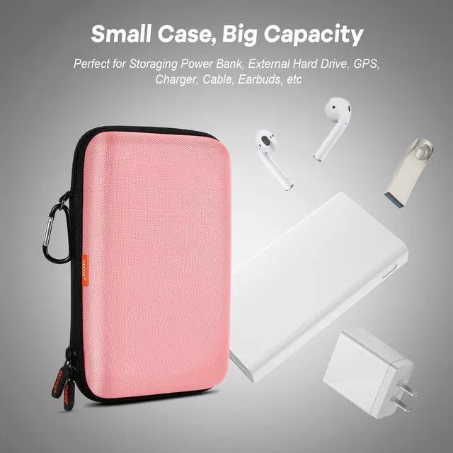 Compact Size, Easy Carrying - The external size of this pink travel case is 8.6"L x 5.7"W x 2.2"H inches, internal size is 8"L x 5"W x 1"H/side. Compact and lightweight design, portable for handholding, with carabiner for handing in your bag or put it into your backpack or briefcase ^^ Large Capacity Electronic Case - This portable carrying case was designed to be a universal compatibilty case, which can work perfectly as a gps case, hard drive case, power bank case, charger case, heart monitor case, earbuds case, small gadget case, etc ^^ Hard Shell Protective Case - This hard travel case is made of hard shell eva material for shock resistance and high protection of your gadgets, bubble pad for scratch prevention, a elastic strap and double zippers to keep item in place without slipping off ^^ Tidy Storage, Electronic Organizer - This hard case is built-in inner mesh pocket for electronic accessories storage, elastic band to help you keep everything in place.