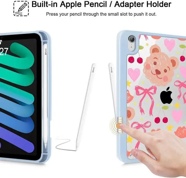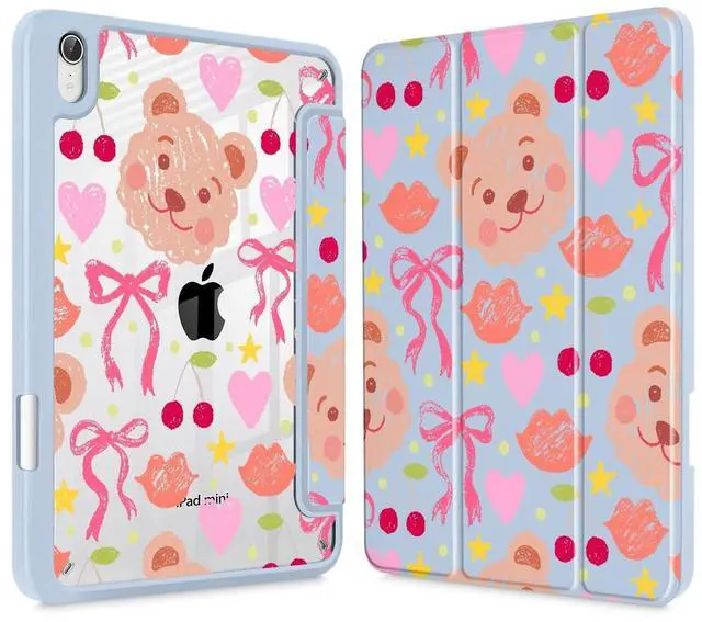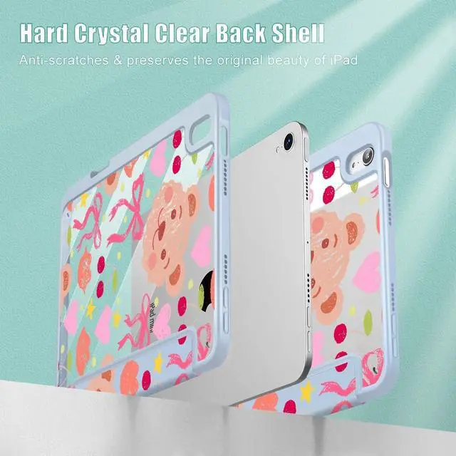 Mektron Printed Case for iPad mini 7 (A17 Pro) 2024/ Mini 6 2021, iPad mini 7th/6th Generation 8.3-inch Liquid Retina Display Cover, Buit in Pencil Holder with Clear Back Shell, Teddy Bow-Blue