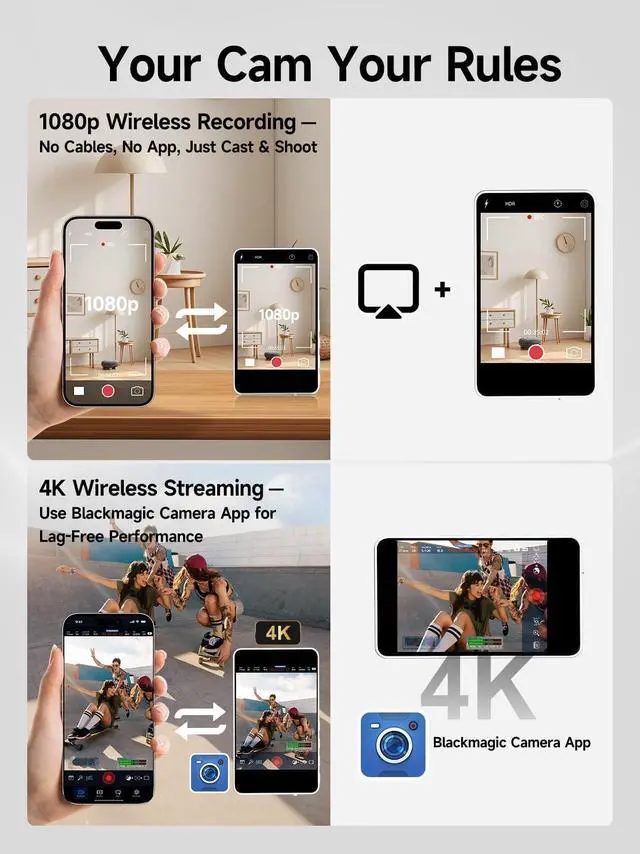 Reminder: NOT for Google Pixel devices ^^ Ture Wireless & 164FT Remote MonitorCompared to traditional remote controls that only allow for close-range adjustments of shooting angles, our back camera monitor iphone instantly mirrors your smartphone screen via a wireless connection. This vlog selfie monitor screen enables you to take photos or start/stop video recordings, freeing you from tangled cables. With a range of up to 164FT (50m), it's perfect for capturing distant shots without the need to touch or reposition your phone ^^ P2P Tech & 4K 30fps