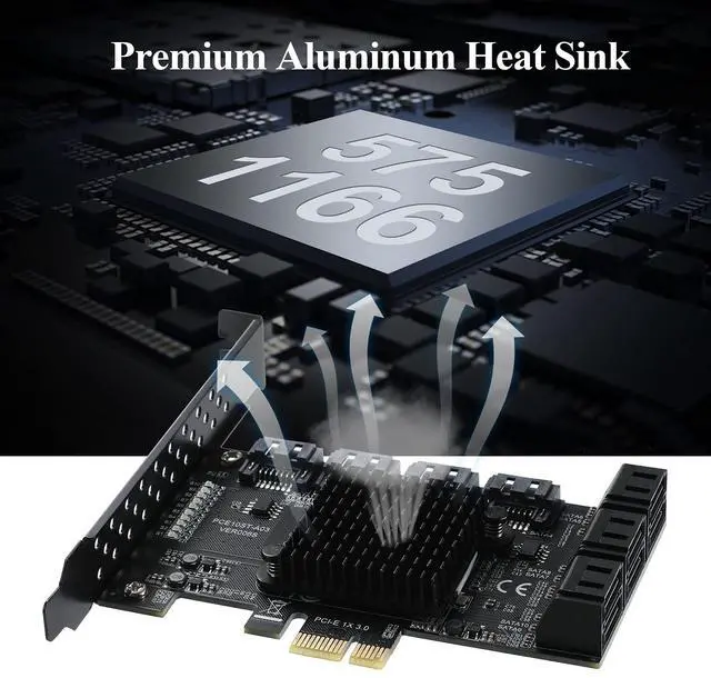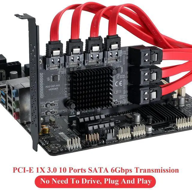 With this PCI-E 3.0 1X SATA card, you can add 10 SATA 3.0 6 Gbps devices to your computer. Provide 1X SATA 6Gbps ports for PCs and Servers. ^^ The PCI-E SATA card contains 10 SATA cables, 15pin SATA Power Splitter Cable and Low Profile Bracket to simplify the connection. ^^ Use the 1X ASMedia ASM1166+JMB575 chip PCIE 3.0 Serial controller to effectively improve card stability and compatibility. Support SATA III speed 6Gbps, SATA II speed 3Gbps, SATA 1 speed 1.5G bps. ^^ Connect 10 mass storage devices at the same time.